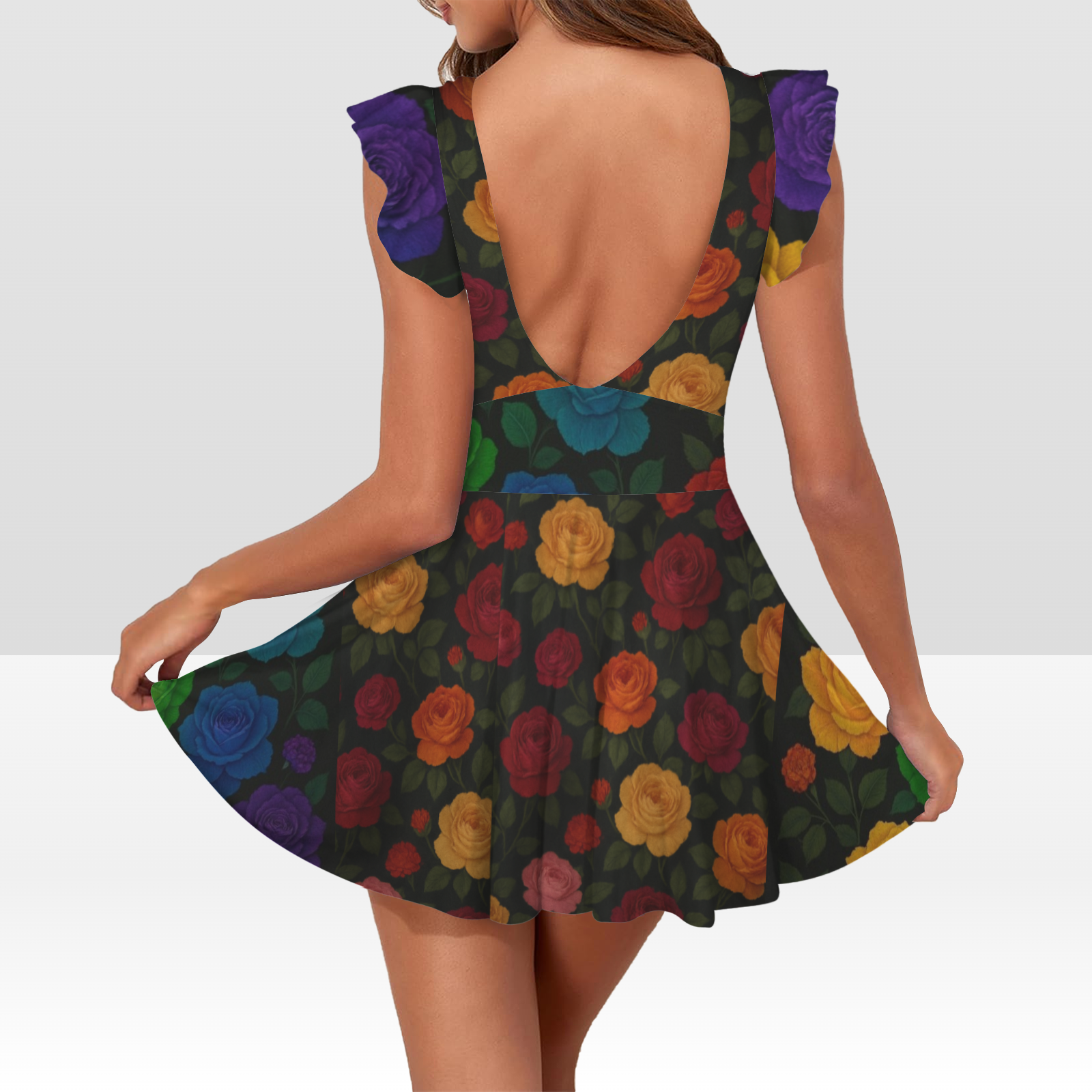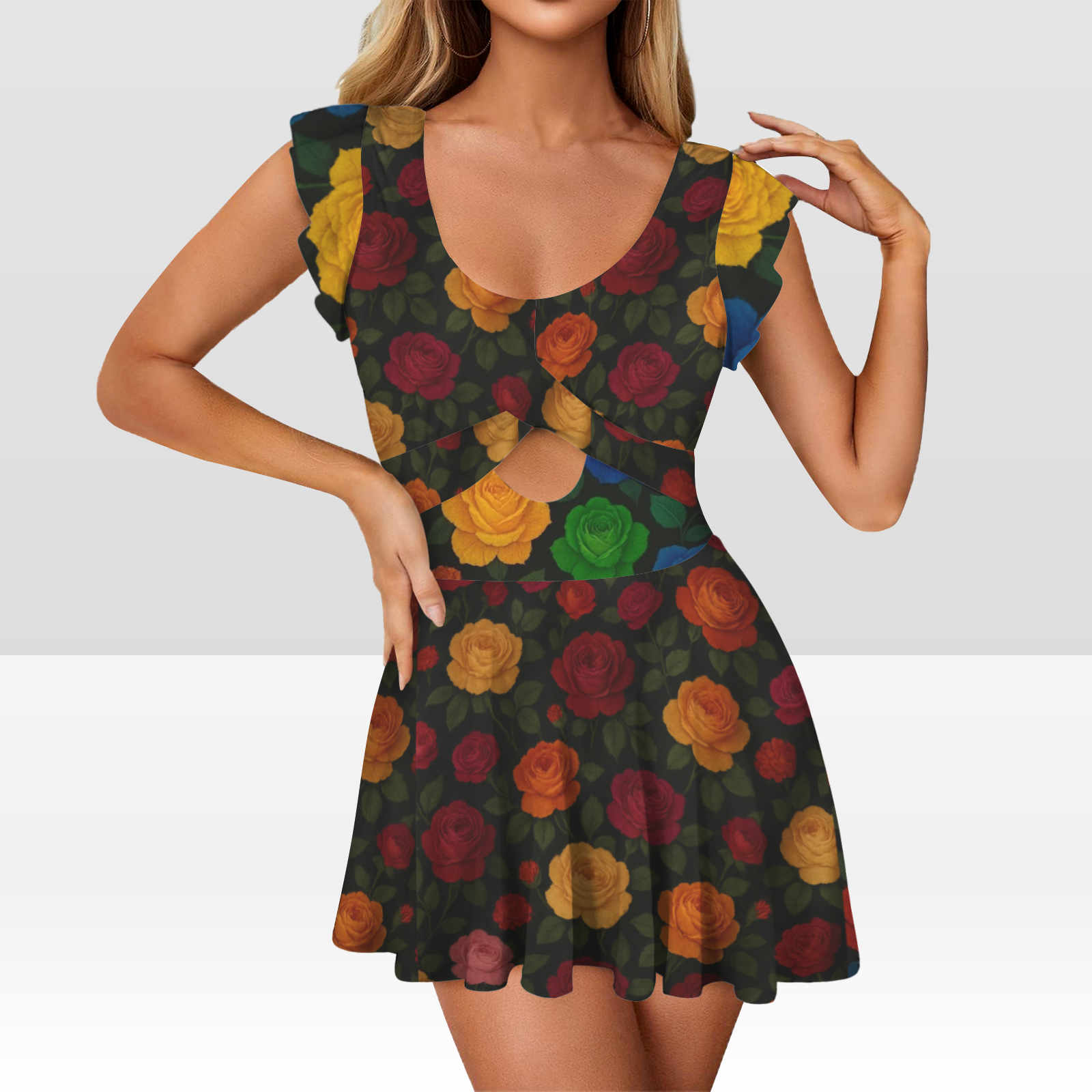 Dipping in elegance drenched in color. this ''LA rosa couture'' swimsuit dress is where classic rose glamour meets modern runway boldness. featuring a vivid rainbow of roses red, yellow, and orange and deep blues - each petal pops against a black backdrop for a striking Del' Gabon statement.