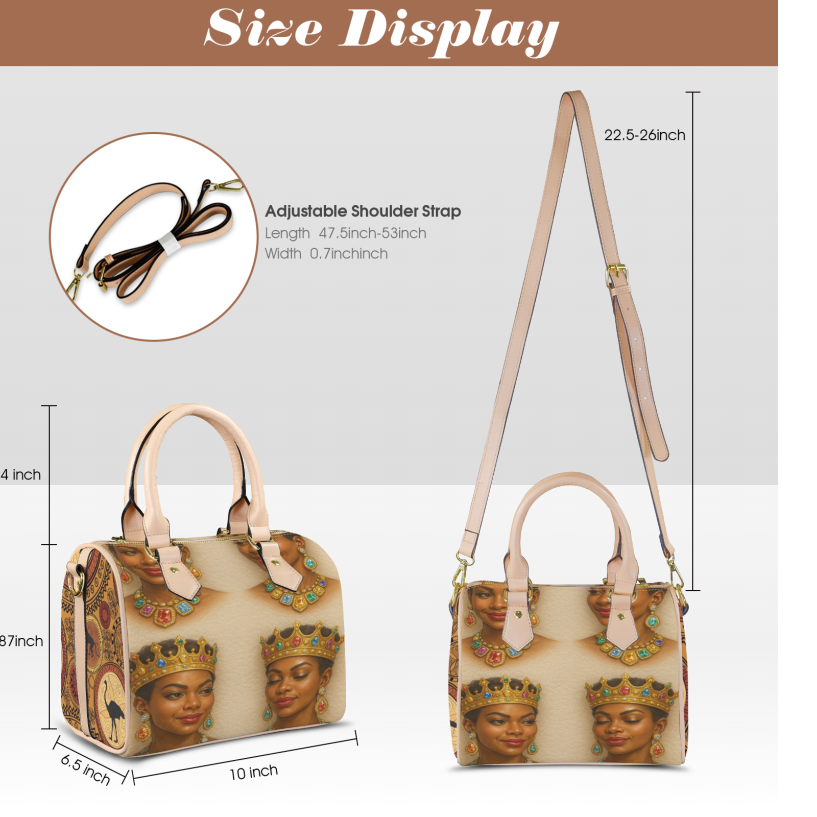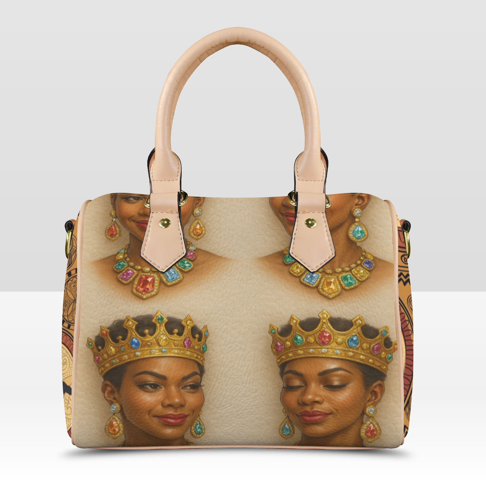 A luxury handbag designed for queens. The kalifia crown jewel blends royal elegance with bold cultural power. Rich artwork on all sides, finished with gold - tone accents and a detachable strap.
