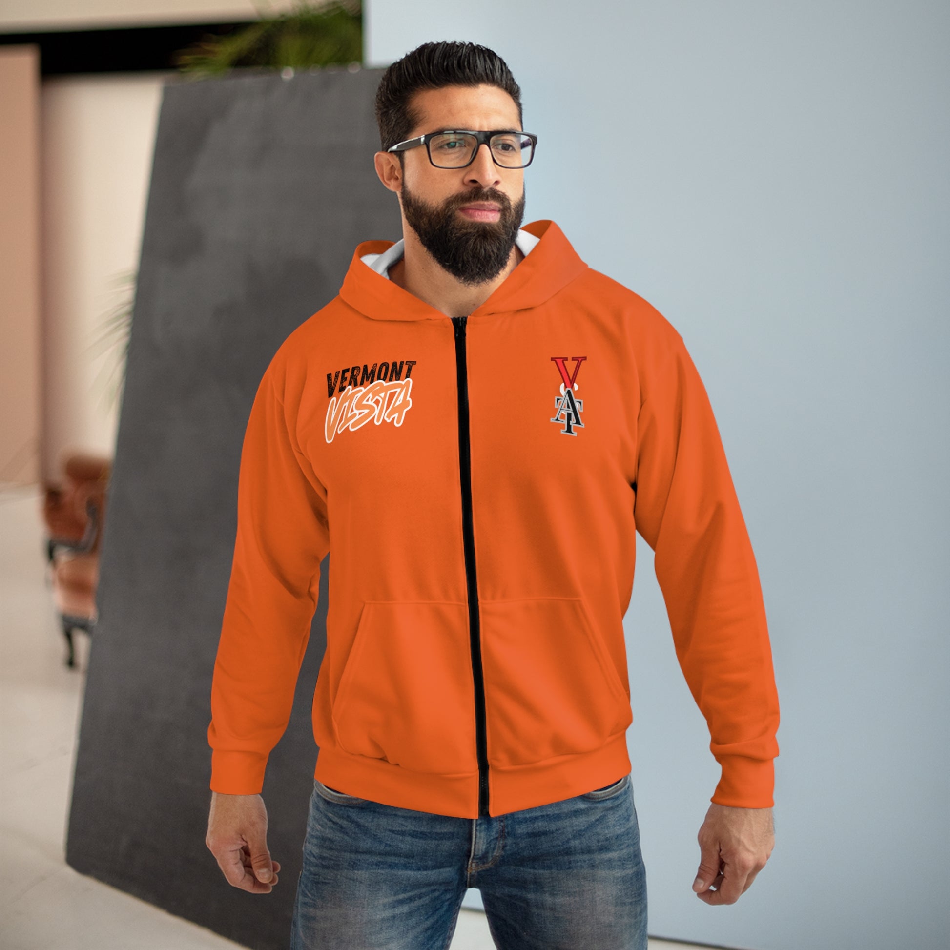 This zipped fleece jacket will keep you nice and toasty through the cold. It’s a great all-over print zip hoodie that is easy to customize without fear of visible white lines at the seams. It has a large front pocket, black zipper, a roomy hood and is custom cut and sewn. It’s your perfect pick this winter.